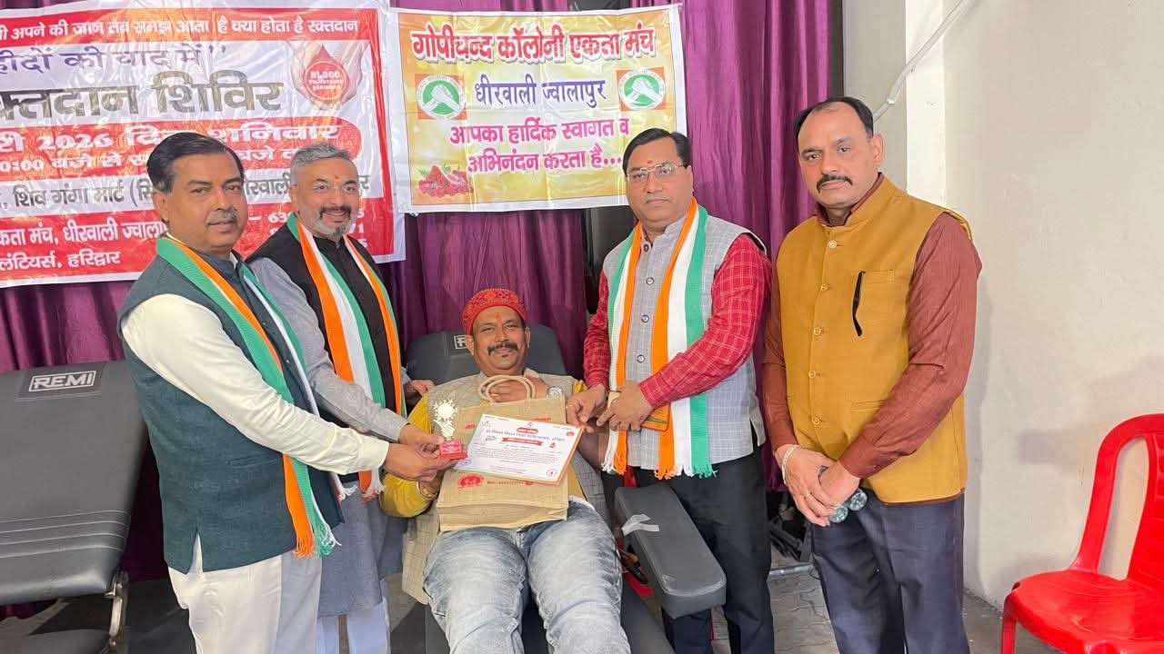 गोपीचंद एकता मंच के महामंत्री व भाजपा जिला सोशल मीडिया संयोजक मनोज शर्मा ने बताया कि गोपीचंद एकता मंच एक सामाजिक संस्था है जो कि निरंतर सामाजिक कार्यों में बढ़ चढ़ कर हिस्सा लेती है चाहें वो स्वच्छता के प्रति लोगों को जागरूक करना हो या पर्यावरण संरक्षित करने हेतु वृक्षारोपण करना हो तथा रक्तदान या अन्य किसी भी माध्यम से जरूरतमंद लोगों की मदद करना हो। जिला रक्त कोष के डाक्टर अंकुर सैनी ने बताया कि आज 45 यूनिट रक्त प्राप्त हुआ जिसमें महिलाओं ने भी बढ़-चढ़कर भागीदारी निभाई है। इस अवसर पर भाजपा जिला उपाध्यक्ष श्री लव शर्मा, लोकसभा सोशल मीडिया संयोजक आशीष झा, ज्वालापुर नगर मंडल अध्यक्ष वरुण वशिष्ठ,मंडल महिला मोर्चा अध्यक्ष श्रीमती चंचल कौर, मोहित शर्मा ,वरुण चौहान ,वेदपाल चौहान , राजकमल सैनी जी ,अमित सैनी ,रविकांत जी शिवशंकर पांडेय, पंकज बागड़ी, अश्विन चौहान तथा गोपीचंद कालोनी एकता मंच धीरवाली के अध्यक्ष विनय तिवारी,उपाध्यक्ष अश्वनी पाल, वेदपाल चौहान, मंत्री जितेंद्र शर्मा, मनोज धीमान, अरविंद कुशवाह, कोषाध्यक्ष गजेंद्र धीमान, सौरभ सक्सेना अन्य सदस्य उपस्थित रहे।