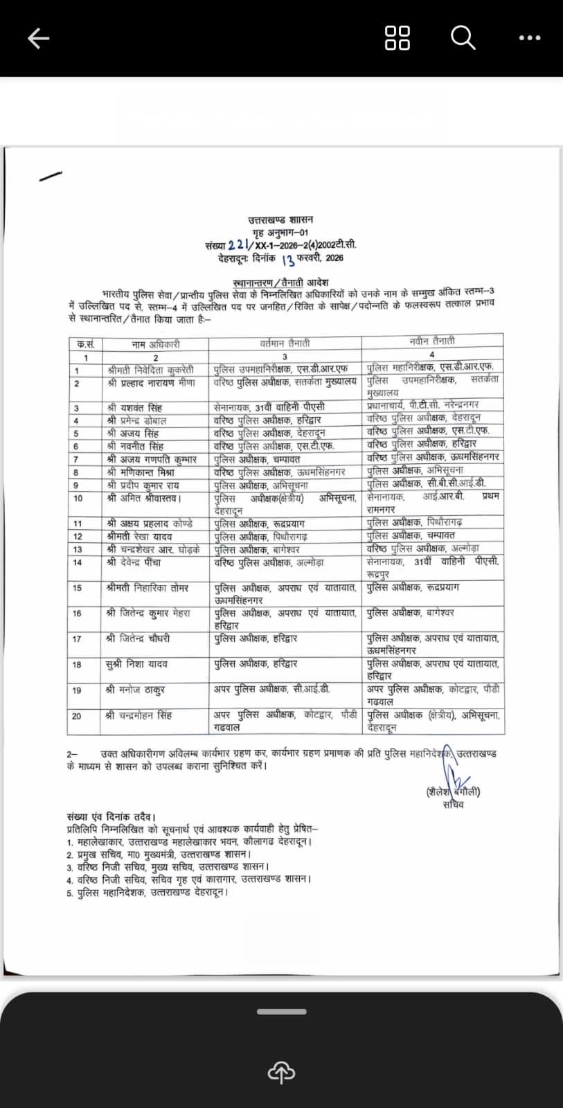 (शहजाद अली हरिद्वार)देहरादून। उत्तराखंड शासन ने पुलिस महकमे में बड़ा प्रशासनिक फेरबदल करते हुए आईपीएस अधिकारियों के तबादलों की नई सूची जारी कर दी है।