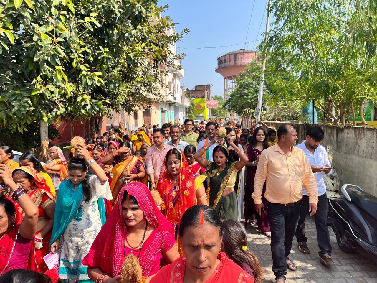 कलश यात्रा में महिलाओं की सहभागिता देखते ही बनती थी। सैकड़ों महिलाएं पारंपरिक पूर्वांचली परिधान – पीली-लाल साड़ियों में, सिर पर कलश धारण किए हुए, भक्ति गीत गातीं और नाचती-गाती हुई चल रही थीं। महिलाएं “छठी मइया की जय” और “सूर्य देवता की जय” के जयघोष करती हुई यात्रा को जीवंत बना रही थीं।