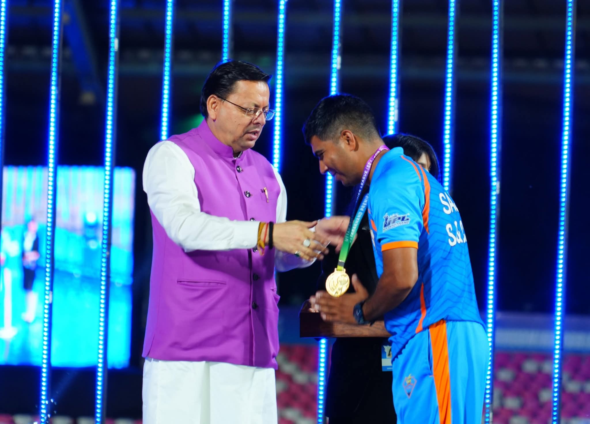 (शहजाद अली हरिद्वार)देहरादून के राजीव गांधी अंतर्राष्ट्रीय स्टेडियम, रायपुर में आयोजित उत्तराखण्ड प्रीमियर लीग 2025 के समापन समारोह में मुख्यमंत्री पुष्कर सिंह धामी ने मुख्य अतिथि के रूप में शिरकत की। मुख्यमंत्री ने विजेता टीम को उत्कृष्ट प्रदर्शन के लिए बधाई देते हुए सभी खिलाड़ियों और आयोजन समिति की सराहना की।मुख्यमंत्री ने कहा कि खेलों में हार-जीत सामान्य बात है, लेकिन सच्चा खिलाड़ी वही होता है जो हार से सीखकर और मजबूत बनता है। उन्होंने कहा कि खेल व्यक्ति के शरीर, मन और चरित्र को मजबूत करते हैं तथा अनुशासन, टीमवर्क और संघर्ष की भावना सिखाते हैं। उन्होंने प्रधानमंत्री नरेंद्र मोदी के नेतृत्व में ‘खेलो इंडिया’ और ‘फिट इंडिया मूवमेंट’ जैसे अभियानों से देश में खेल संस्कृति को नई दिशा मिलने की बात कही।मुख्यमंत्री धामी ने कहा कि क्रिकेट एसोसिएशन ऑफ उत्तराखण्ड न केवल पुरुष क्रिकेट बल्कि महिला क्रिकेट को भी सशक्त बना रहा है। महिला खिलाड़ियों की चार टीमों के शानदार प्रदर्शन की उन्होंने सराहना की और कहा कि यह पहल राज्य के खेल भविष्य के लिए प्रेरणादायक है। उन्होंने राघवी बिष्ट, प्रेमा रावत और नंदनी कश्यप जैसी खिलाड़ियों की उपलब्धियों का उल्लेख करते हुए कहा कि उत्तराखण्ड की बेटियाँ आज हर क्षेत्र में नई मिसाल कायम कर रही हैं।मुख्यमंत्री ने कहा कि सरकार खेल संस्कृति को बढ़ावा देने के लिए निरंतर प्रयासरत है। हाल ही में 38वें राष्ट्रीय खेलों का सफल आयोजन उत्तराखण्ड को “देवभूमि” के साथ “खेलभूमि” के रूप में स्थापित करने की दिशा में बड़ा कदम है। उन्होंने बताया कि शीघ्र ही “स्पोर्ट्स लेगेसी प्लान” लागू होगा, जिसके तहत आठ शहरों में 23 खेल अकादमियां स्थापित की जाएंगी। साथ ही नई खेल नीति के अंतर्गत खिलाड़ियों को सरकारी नौकरी, खेल किट योजना, उदीयमान खिलाड़ी योजना और 4% क्षैतिज आरक्षण जैसी सुविधाएं दी जा रही हैं।