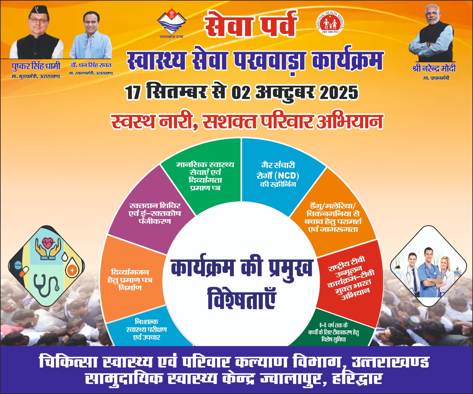 (शहजाद अली हरिद्वार)हरिद्वार। जनपद वासियों को बेहतर स्वास्थ्य सेवा उपलब्ध करने के उद्देश्य से शासन के निर्देशों के अनुपालन में स्वस्थ नारी सशक्त परिवार अभियान के तहत स्वास्थ्य पखवाड़े का आयोजन किया जा रहा है आज स्वास्थ्य शिविर का आयोजन ज्वालापुर स्थित सामुदायिक स्वास्थ्य केंद्र में किया गया जिसका शुभारंभ विधायक रानीपुर आदेश चौहान द्वारा किया गया।स्वास्थ्य शिविर को संबोधित करते हुए विधायक रानीपुर आदेश चौहान ने कहा कि यशस्वी प्रधानमंत्री नरेंद्र मोदी का जन्मदिवस के अवसर पर देश भर में स्वास्थ नारी सशक्त परिवार अभियान के तहत स्वास्थ्य शिविरो का आयोजन किया जा रहा है जिसका मूल उद्देश्य आम जन एवं महिलाओं के स्वास्थ्य बेहतर उपचार करना प्राथमिकता है। उन्होंने कहा कि प्रदेश में मुख्य मंत्री एवं स्वास्थ्य मंत्री के निर्देशन में जनपद के सभी क्षेत्रों में स्वास्थ्य शिविरो का आयोजन किया जा रहा है जिसका उद्देश्य सभी को निशुल्क स्वास्थ्य सुविधाएं उपलब्ध कराना है ।इस अवसर पर मुख्य चिकित्सा अधिकारी डॉ आरके सिंह ने उपस्थित सभी मुख्य अतिथि एवं जनप्रतिनिधियों का कार्यक्रम में उपस्थित होने के लिए धन्यवाद एवं आभार व्यक्त किया।