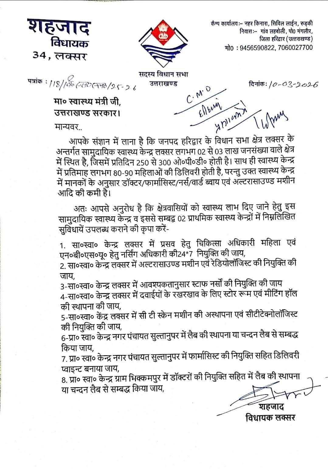विधायक शहजाद ने कहा कि लक्सर क्षेत्र के विकास और युवाओं के भविष्य को ध्यान में रखते हुए शिक्षा और स्वास्थ्य सेवाओं को मजबूत करना उनकी प्राथमिकता है।