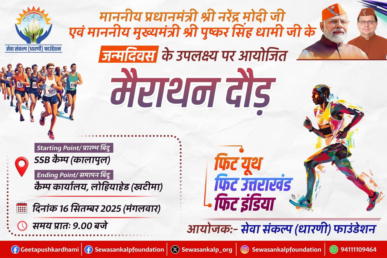 मैराथन दौड़ का आयोजन दिनांक 16 सितम्बर 2025, मंगलवार प्रातः 9:00 बजे से किया जाएगा, जिसका स्टार्टिंग पॉइंट एसएसबी कैंप (कालापुल) तथा एंडिंग पॉइंट कैंप कार्यालय लोहिया हेड (खटीमा) रहेगा।