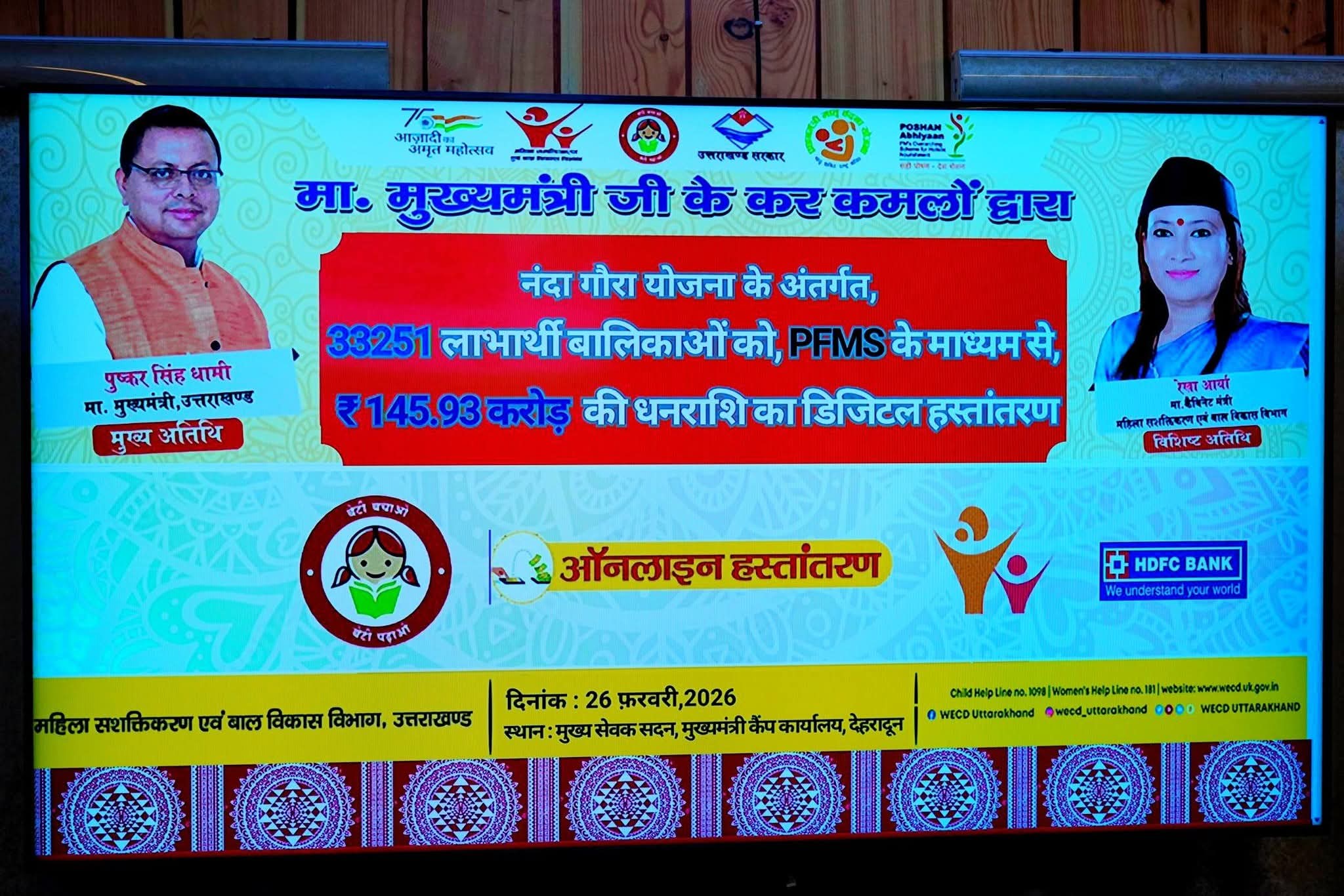मुख्यमंत्री ने गुरुवार को नंदा गौरा योजना के तहत वित्तीय वर्ष 2025-26 के लिए प्रदेश की 33,251 बालिकाओं के खाते में डीबीटी के माध्यम से 1,45,93.00 (एक अरब पैंतालीस करोड़ तिरान्नबे लाख रुपए) की धनराशि हस्तांतरित की।