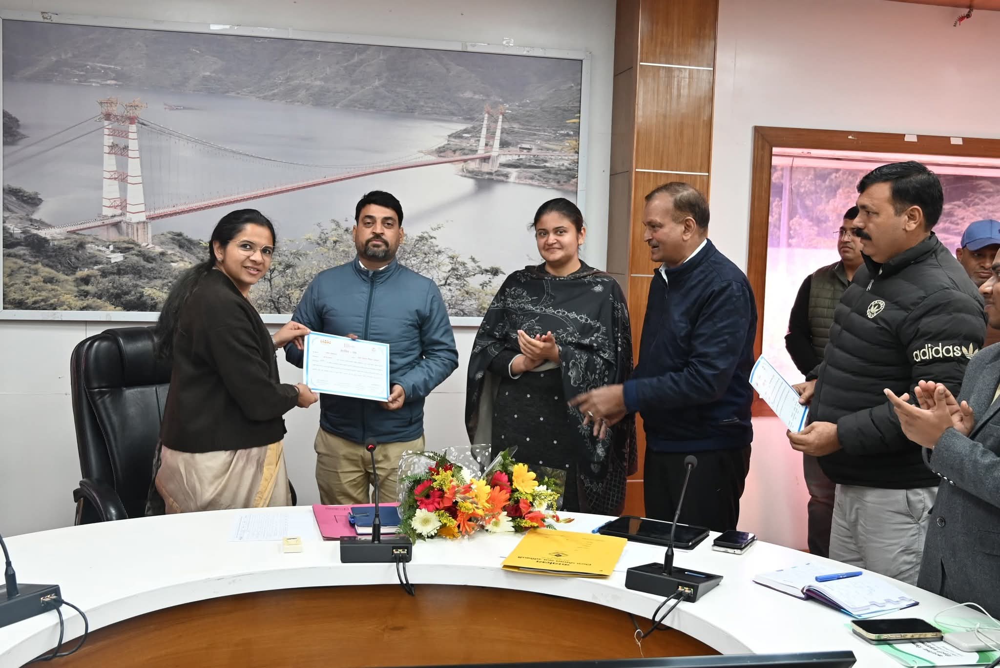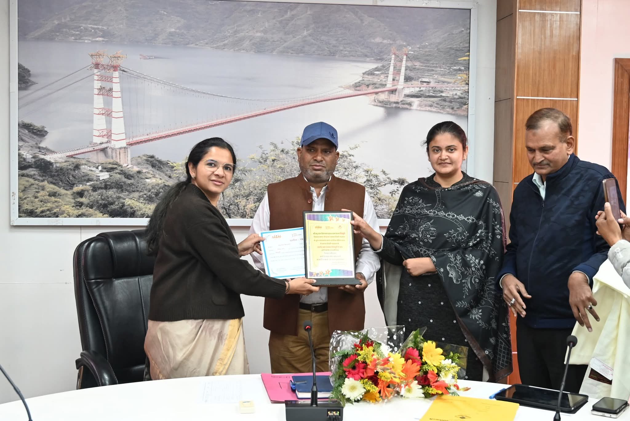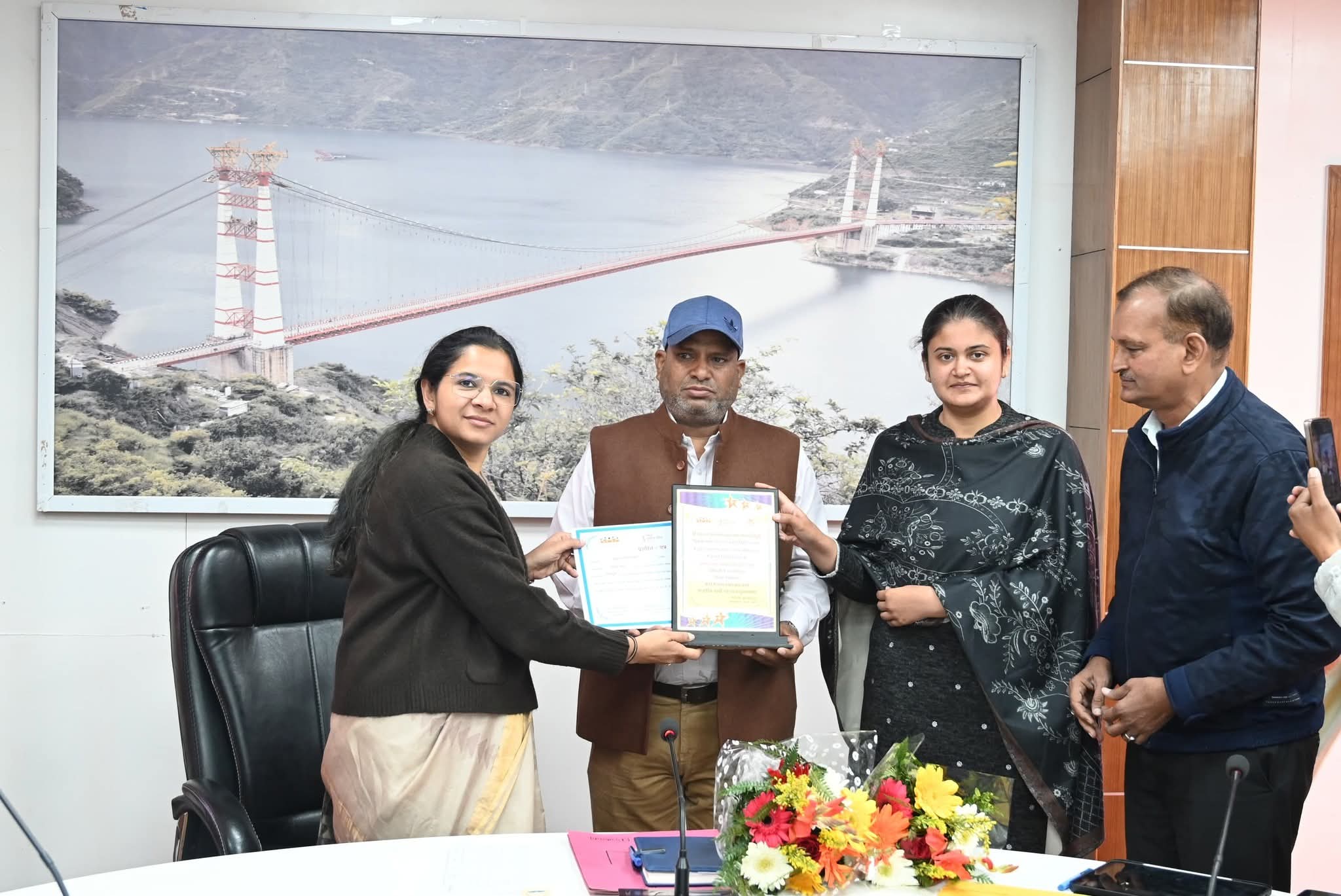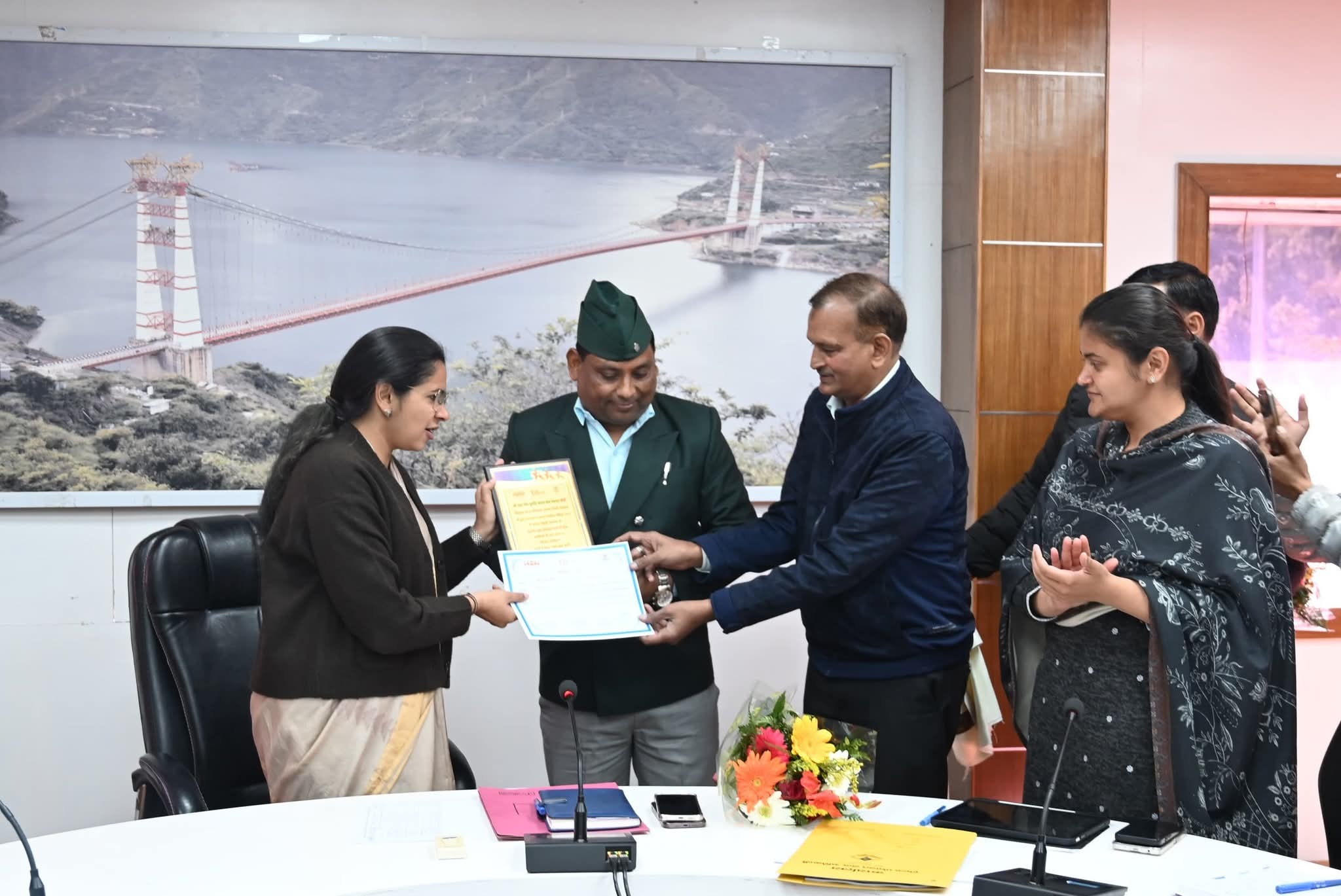 (शहजाद अली हरिद्वार)नई टिहरी । सोमवार को जिला सभागार नई टिहरी में जनता दरबार कार्यक्रम के दौरान जिलाधिकारी टिहरी गढ़वाल नितिका खण्डेलवाल द्वारा समान नागरिक संहिता में सबसे पहले शत प्रतिशत पंजीकरण कराने वाले ग्राम पंचायत पाथौ के प्रधान पियार सिंह पुंडीर एवं शिवपुरी के प्रधान प्रभु लाल को प्रशस्तिपत्र, स्मृति चिन्ह् एवं शॉल भेंट कर सम्मानित किया गया। इसके साथ ही संबंधित ग्राम पंचायत विकास अधिकारी पंकज उनियाल एवं विनित रावत को भी सम्मानित किया गया।